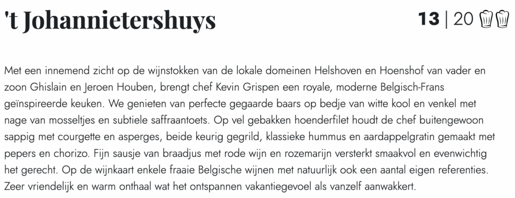 Met veel trots mogen we melden dat βt Johannietershuys opnieuw 13/20 scoorde in de Gault&Millau. Een erkenning die ons motiveert om verder te blijven groeien en jullie keer op keer een onvergetelijke smaakervaring te bezorgen.